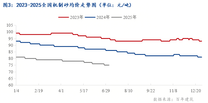 據(jù)百年建筑網(wǎng)數(shù)據(jù)顯示,截至2025年6月30日,天然砂均價109元/噸,同比比下跌12.8%;機(jī)制砂均價75元/噸,同比下跌12.8%;碎石均價74元/噸,月同比下跌10.84%。多地雨水影響較大,建筑施工進(jìn)度下降,采購砂石供應(yīng)攪拌站、直供項目量下降,貿(mào)易競爭加劇,沿江、沿海砂石礦山產(chǎn)能過剩,價格持續(xù)走低。