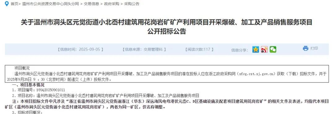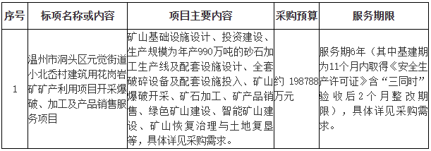 近日,浙江溫州市公共資源交易網(wǎng)發(fā)布溫州市洞頭區(qū)元覺(jué)街道小北岙村建筑用花崗巖礦礦產(chǎn)利用項(xiàng)目開(kāi)采爆破、加工及產(chǎn)品銷售服務(wù)項(xiàng)目公開(kāi)招標(biāo)公告。