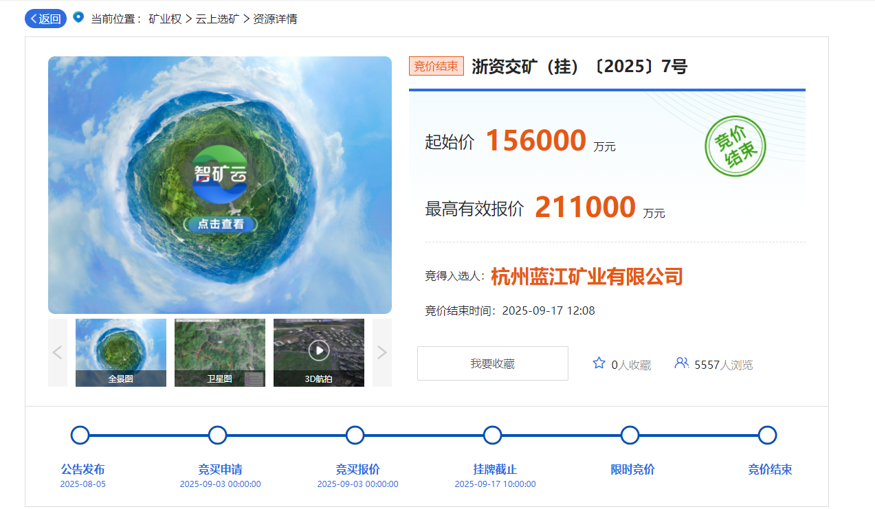 近日,浙江省自然資源網(wǎng)上交易中心公布浙江省建德市梅城鎮(zhèn)濱江村官路邊礦區(qū)建筑用安山巖礦拍賣結(jié)果信息,競得入選人為杭州藍(lán)江礦業(yè)有限公司,最高有效報(bào)價(jià)21.1億元。