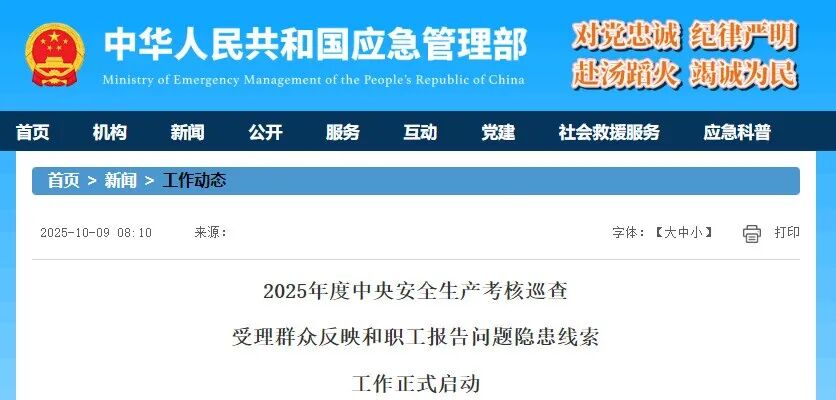 2025年度中央安全生產(chǎn)考核巡查受理群眾反映和職工報告問題隱患線索工作正式啟動。