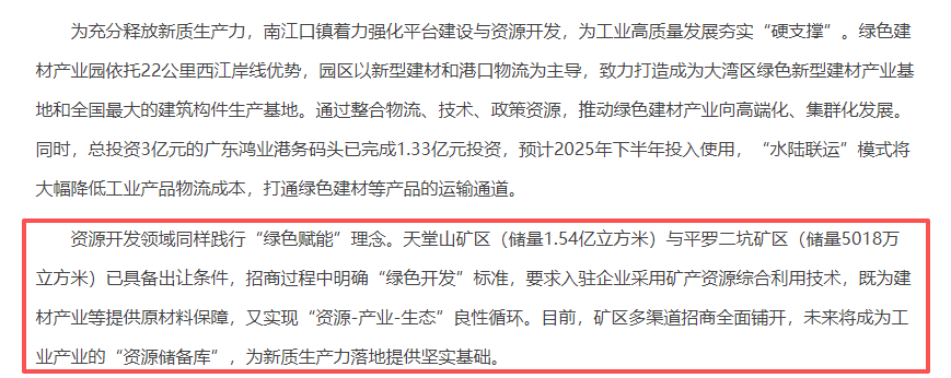 近日,根據(jù)郁南縣人民政府門(mén)戶(hù)網(wǎng)站報(bào)道,廣東云浮郁南天堂山礦區(qū)(儲(chǔ)量1.54億立方米)與平羅二坑礦區(qū)(儲(chǔ)量5018萬(wàn)立方米)已具備出讓條件,招商過(guò)程中明確“綠色開(kāi)發(fā)”標(biāo)準(zhǔn),要求入駐企業(yè)采用礦產(chǎn)資源綜合利用技術(shù),既為建材產(chǎn)業(yè)等提供原材料保障,又實(shí)現(xiàn)“資源-產(chǎn)業(yè)-生態(tài)”良性循環(huán)。目前,礦區(qū)多渠道招商全面鋪開(kāi),未來(lái)將成為工業(yè)產(chǎn)業(yè)的“資源儲(chǔ)備庫(kù)”,為新質(zhì)生產(chǎn)力落地提供堅(jiān)實(shí)基礎(chǔ)。