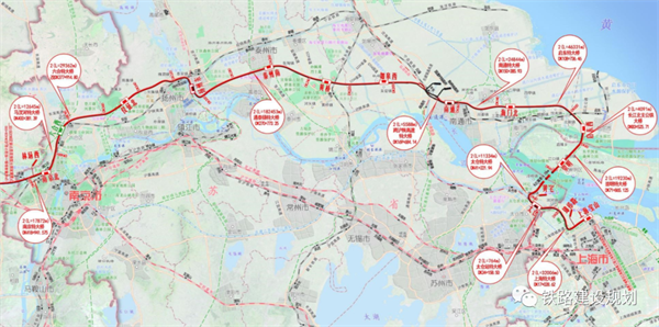 項(xiàng)目起自上海市新建上海寶山站,經(jīng)江蘇省蘇州市、南通市、泰州市、揚(yáng)州市、南京市及安徽省滁州市、合肥市,接入既有合肥南站。線路全長(zhǎng)553.762公里,其中新建鐵路519.046公里,設(shè)計(jì)時(shí)速350公里。全線設(shè)16座車站,其中新建車站10座。