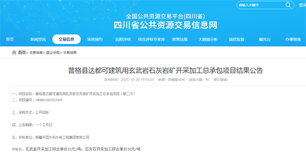 近日,四川省公共資源交易信息網(wǎng)發(fā)布涼山彝族自治州普格縣達(dá)都可建筑用玄武巖石灰?guī)r礦開采加工總承包項(xiàng)目結(jié)果公告,新疆兵團(tuán)水利水電工程集團(tuán)有限公司玄武巖開采加工綜合單價(jià)31元/噸、石灰石開采加工綜合單價(jià)30元/噸中標(biāo)。