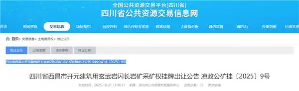 10月21日,四川省公共資源交易信息網(wǎng)發(fā)布涼山州西昌市開元建筑用玄武巖閃長(zhǎng)巖礦采礦權(quán)掛牌出讓公告。該礦總資源量超1億噸,生產(chǎn)規(guī)模不低于300萬(wàn)噸/年,擬出讓年限30年,出讓起始價(jià)3.1億元,約3.06元/噸。報(bào)價(jià)時(shí)間為2025年11月17日至2025年12月4日。