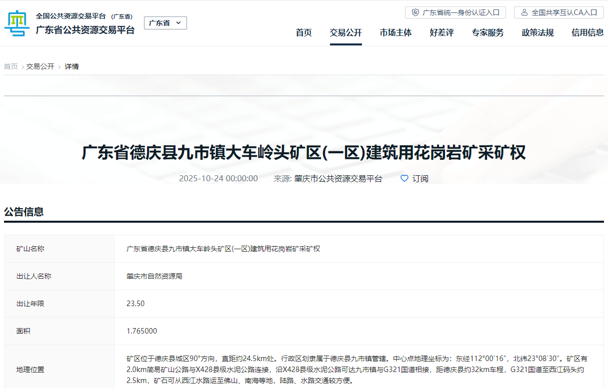 2025年10月24日,廣東肇慶市自然資源局公開(kāi)出讓廣東省德慶縣九市鎮(zhèn)大車嶺頭礦區(qū)(一區(qū))建筑用花崗巖礦采礦權(quán)。