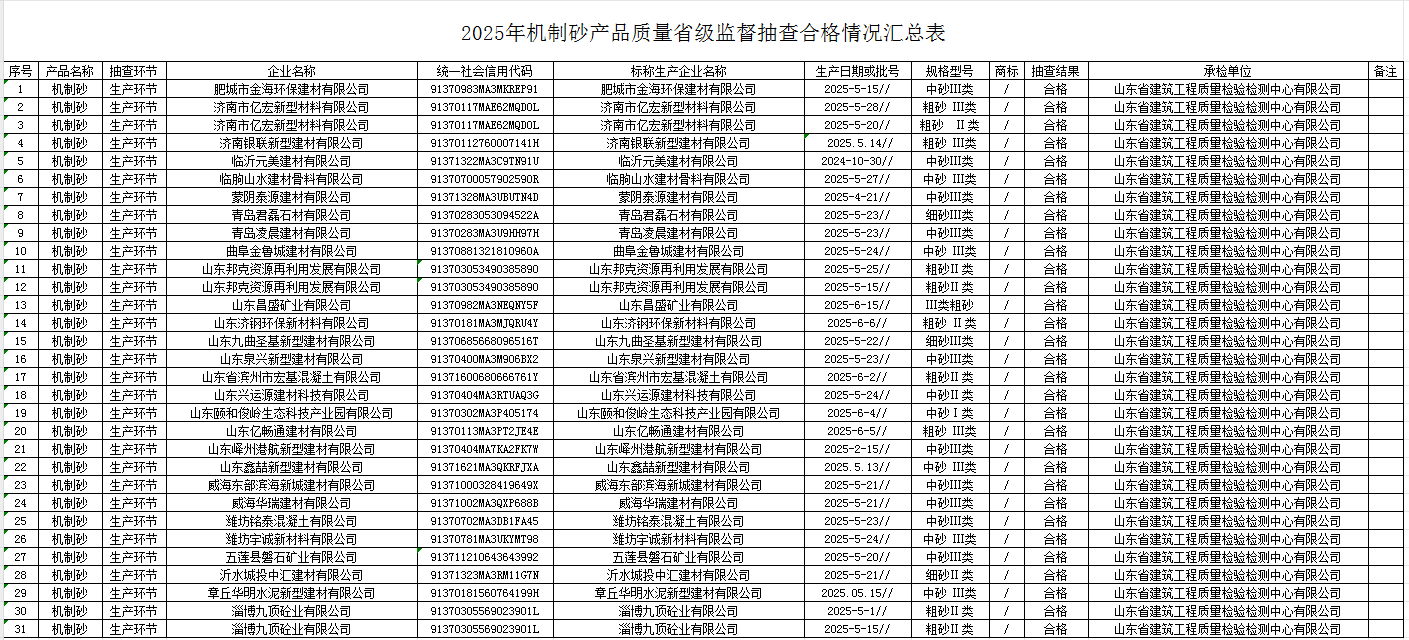 2025年機制砂產(chǎn)品質(zhì)量省級監(jiān)督抽查結(jié)果