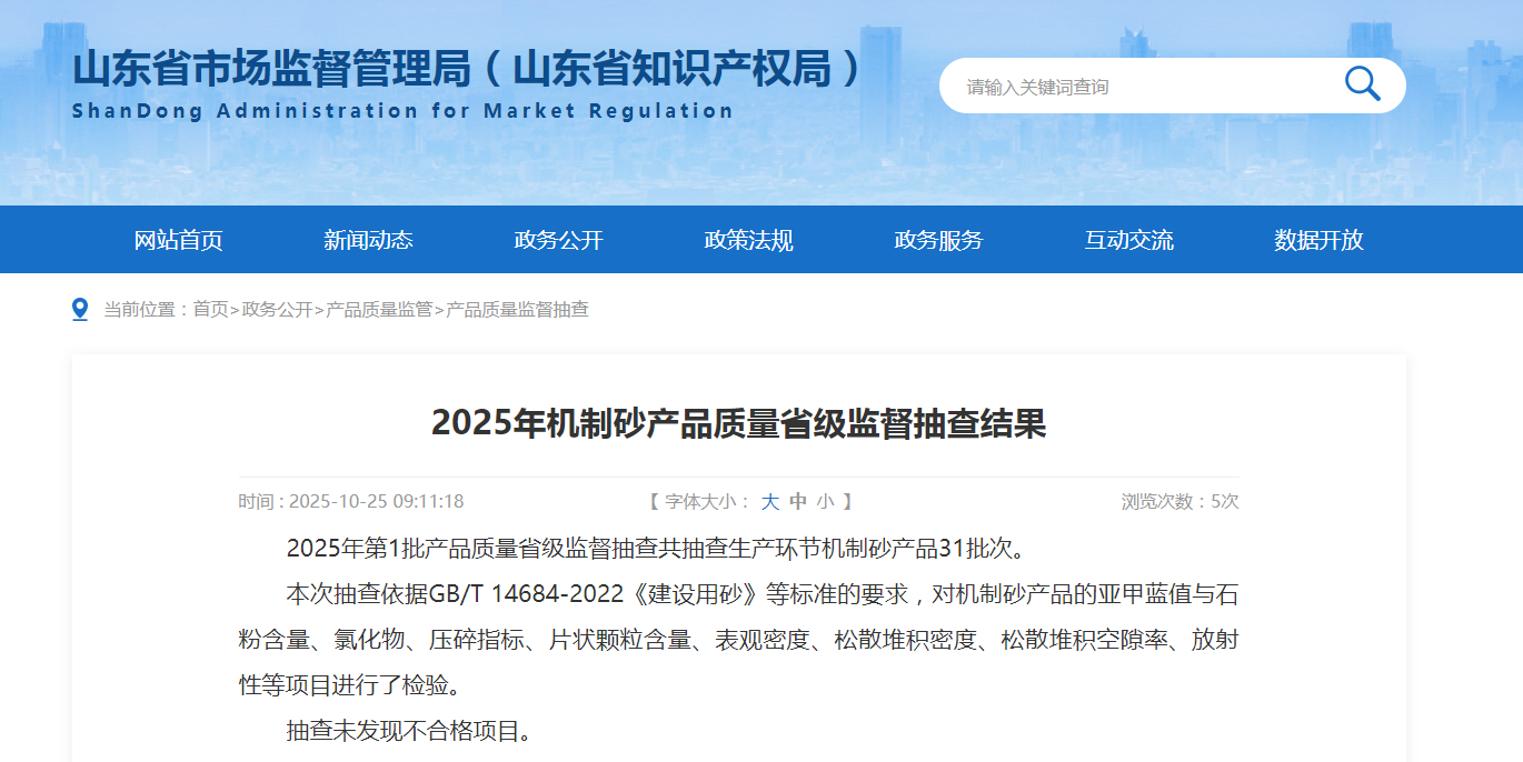 近日,山東省市場監(jiān)管局網(wǎng)站發(fā)布2025年機制砂產(chǎn)品質(zhì)量省級監(jiān)督抽查結(jié)果。