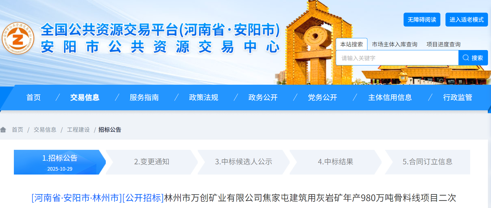 近日,河南安陽(yáng)市公共資源交易中心發(fā)布林州市萬(wàn)創(chuàng)礦業(yè)有限公司焦家屯建筑用灰?guī)r礦年產(chǎn)980萬(wàn)噸骨料線項(xiàng)目二次招標(biāo)公告。