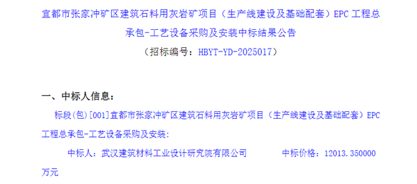 近日,中國(guó)招投標(biāo)公共服務(wù)平臺(tái)發(fā)布湖北宜都市張家沖礦區(qū)900萬(wàn)噸/年建筑石料用灰?guī)r礦項(xiàng)目(生產(chǎn)線建設(shè)及基礎(chǔ)配套)EPC工程總承包-工藝設(shè)備采購(gòu)及安裝中標(biāo)結(jié)果公告。武漢建筑材料工業(yè)設(shè)計(jì)研究院有限公司報(bào)價(jià)超1.2億元中標(biāo)。