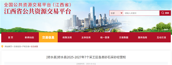 10月31日,江西省公共資源交易平臺發(fā)布九江市修水縣2025-2027年7個采工區(qū)各類砂石采砂經(jīng)營權(quán)出讓公告,總規(guī)劃開采面積為1.85平方公里,規(guī)劃期總開采量658.37萬噸,出讓期限3年,掛牌價(jià)1.64億元,折合24.91元/噸。
