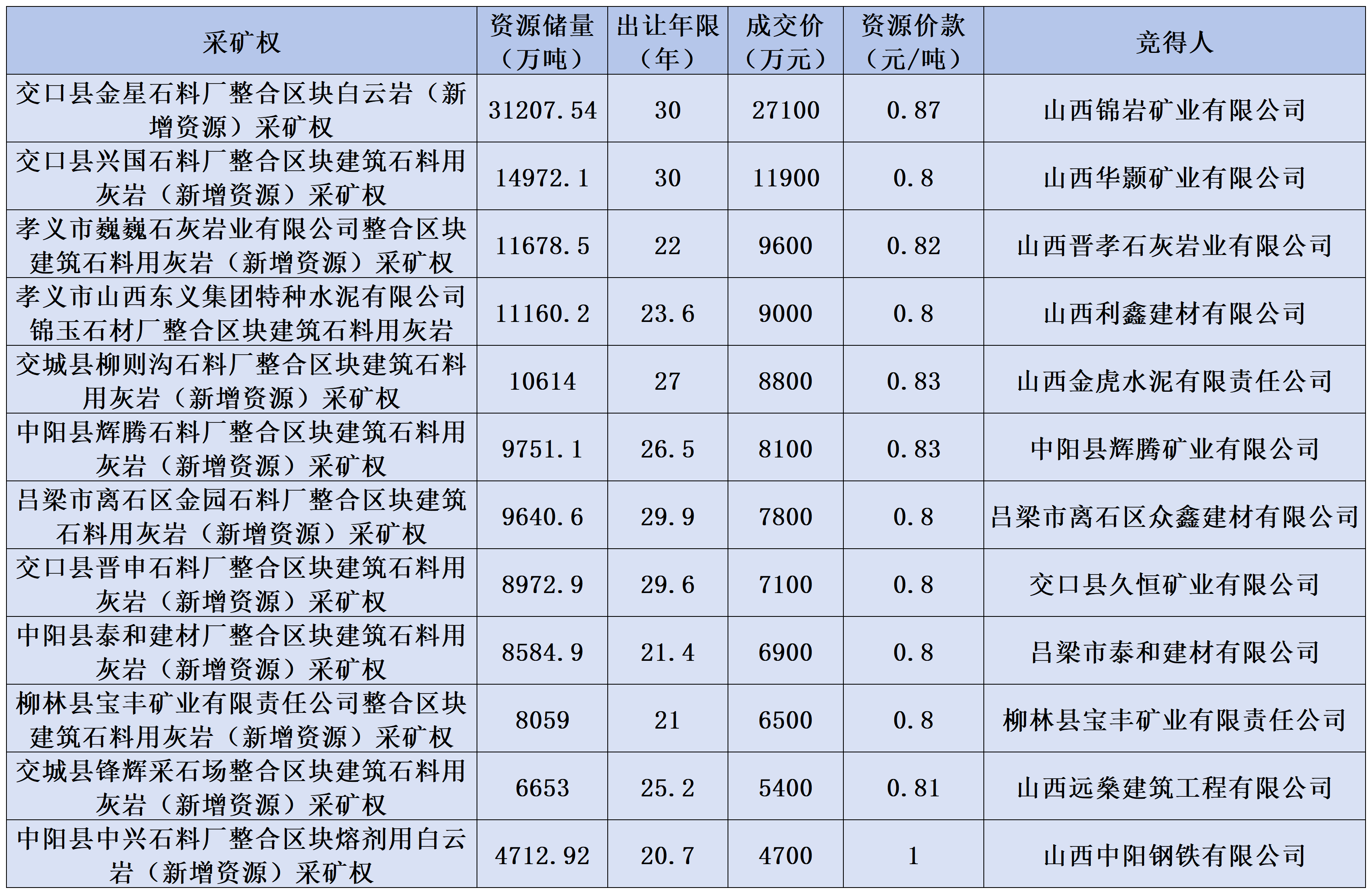 3、孝義市巍巍石灰?guī)r業(yè)有限公司整合區(qū)塊建筑石料用灰?guī)r(新增資源)采礦權(quán)位于孝義市南陽鄉(xiāng)西田莊村,礦區(qū)面積0.9391平方公里,資源儲量近1.17億噸,擬出讓年限22年。山西晉孝石灰?guī)r業(yè)有限公司以9600萬元競得該礦權(quán),礦山資源價款約0.82元/噸。