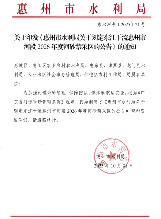 此次公告的發(fā)布,是惠州市水利局落實《廣東省河道采砂管理條例》、規(guī)范東江干流河道采砂行為的重要舉措,為2026年度東江干流惠州市河段河砂管理工作提供了明確依據(jù)。