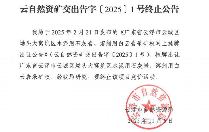 11月6日,廣東省云浮市自然資源局發(fā)布云城區(qū)坳頭大窩坑區(qū)水泥用石灰?guī)r、溶劑用白云巖采礦權(quán)終止出讓公告。