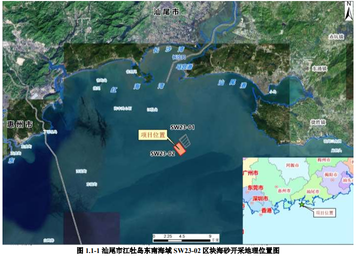 擬開采海砂 SW23-02 礦區(qū)位于廣東省汕尾市江牡島東南側(cè)海域東南約6.2km 處,行政區(qū)域隸屬廣東省汕尾市管轄根據(jù)《廣東省汕尾市江牡島東南海域SW23-02 礦區(qū)回填用海砂資源儲量核實報告》(汕尾市自然資源局,2025年7月),礦區(qū)海砂原礦資源量共2089.88萬方,其中原礦控制資源量1468.5萬方,原礦推斷資源量 621.29萬方。