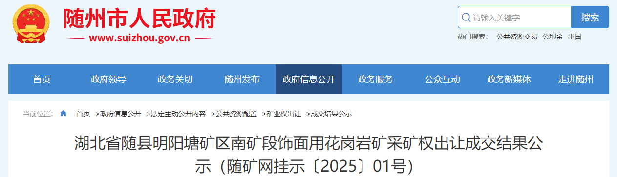 近日,湖北隨州人民政府發(fā)布湖北省隨縣明陽塘礦區(qū)南礦段飾面用花崗巖礦采礦權(quán)掛牌出讓成交結(jié)果公示。隨州市漢隨礦業(yè)有限公司以80282.71萬元成功競得該礦權(quán)。