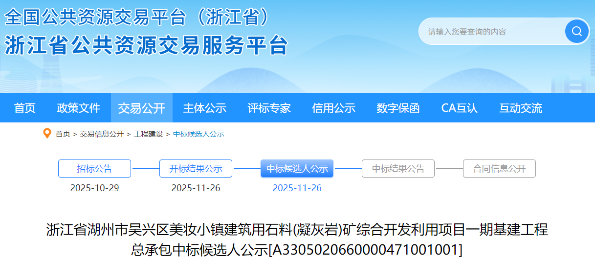 近日,浙江省公共資源交易服務平臺發(fā)布湖州市吳興區(qū)美妝小鎮(zhèn)建筑用石料(凝灰?guī)r)礦綜合開發(fā)利用項目一期基建工程總承包中標候選人公示。共有五家候選人(聯(lián)合體)入圍: