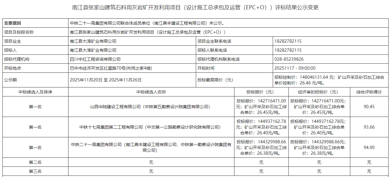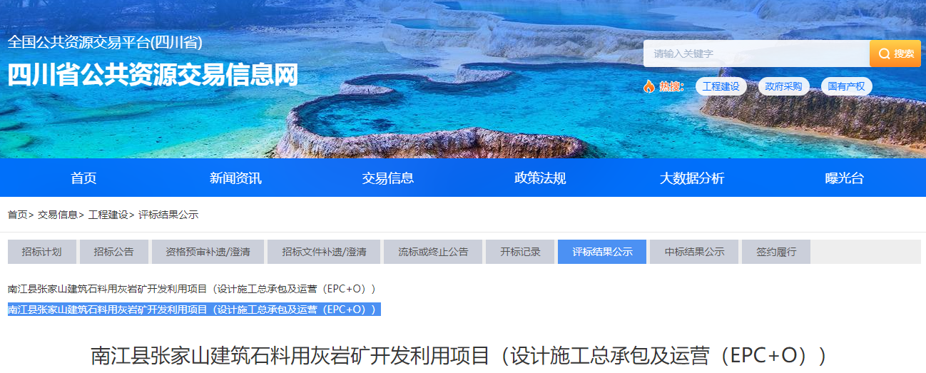 近日,四川省公共資源交易信息網(wǎng)發(fā)布南江縣張家山建筑石料用灰?guī)r礦開發(fā)利用項(xiàng)目(設(shè)計(jì)施工總承包及運(yùn)營(EPC+O))評標(biāo)結(jié)果公示及評標(biāo)結(jié)果變更公示。