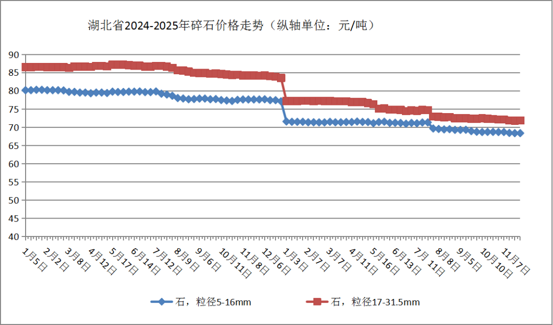 監(jiān)測數(shù)據(jù)顯示:11月份,碎石(粒徑5-16mm)、碎石(粒徑17-31.5mm)全省均價(jià)分別為68.44元/噸、71.90元/噸,環(huán)比分別下降0.35%、0.53%;同比分別下降11.77%、14.65%。具體價(jià)格走勢情況如下圖: