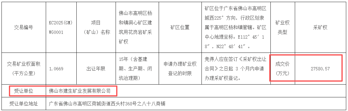 近日,廣東佛山市高明區(qū)政府網(wǎng)發(fā)布佛山市高明區(qū)楊和鎮(zhèn)洞心礦區(qū)建筑用花崗巖礦采礦權(quán)出讓結(jié)果公示。佛山市建生礦業(yè)發(fā)展有限公司以27580.57萬(wàn)元成功競(jìng)得該項(xiàng)目。