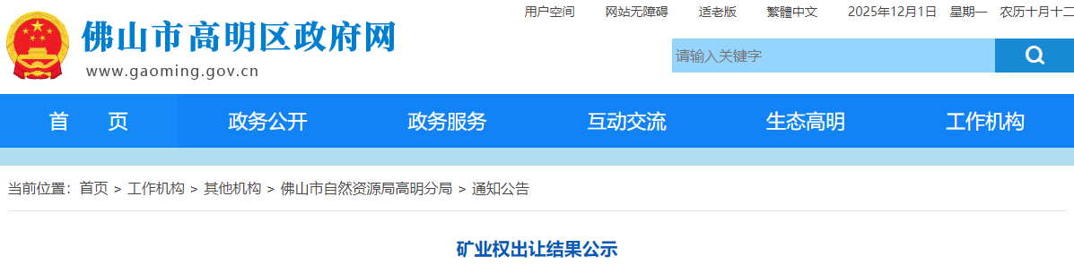 按照《礦業(yè)權(quán)出讓交易規(guī)則》等有關(guān)法律法規(guī),遵循公開(kāi)、公正、公平的原則。佛山市自然資源局局于2025年11月28日網(wǎng)上掛牌成功出讓1宗采礦權(quán)。現(xiàn)將有關(guān)情況公示如下: