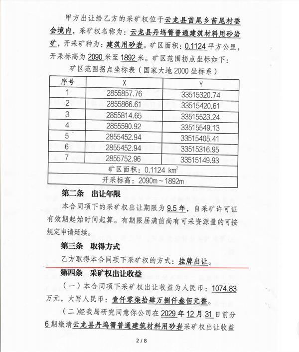 2025年7月15日,云龍縣自然資源局與力豪建材公司簽訂《采礦權(quán)出讓合同書(shū)》,以“協(xié)議出讓”方式向其新增1084.73萬(wàn)噸資源儲(chǔ)量。約定本合同項(xiàng)下的采礦權(quán)出讓期限為9.5年,力豪建材公司取得本合同項(xiàng)下采礦權(quán)的方式為掛牌出讓。8月25日,力豪建材公司取得了該礦的采礦許可證。