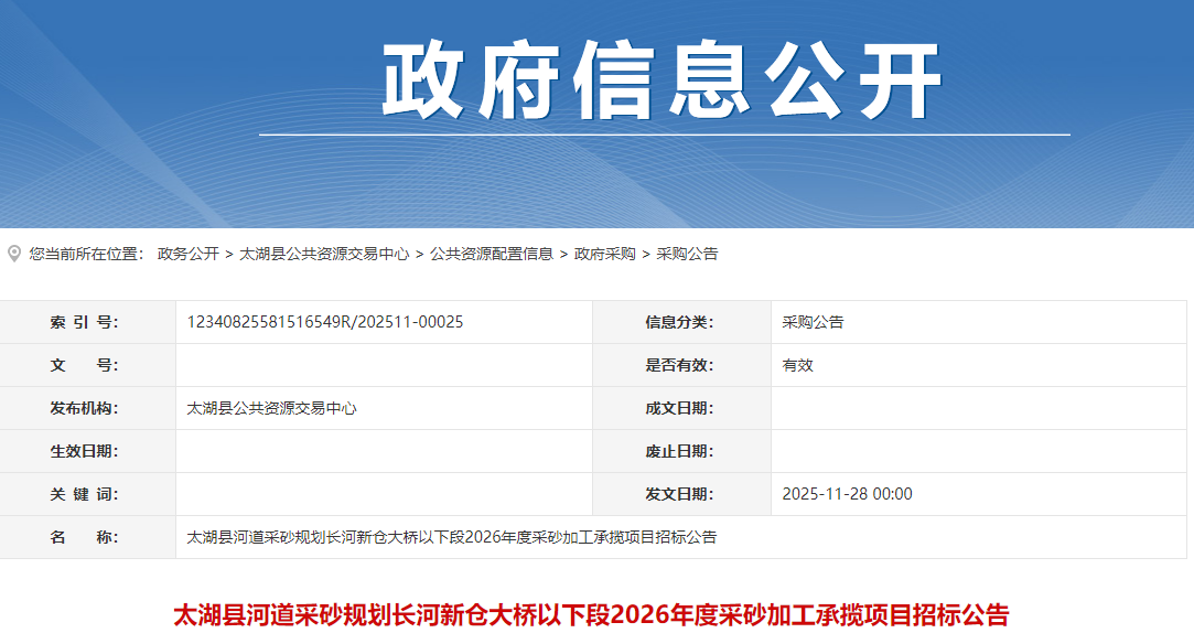 近日,安徽安慶太湖縣人民政府網(wǎng)站發(fā)布太湖縣河道采砂規(guī)劃長河新倉大橋以下段2026年度采砂加工承攬項(xiàng)目招標(biāo)公告。