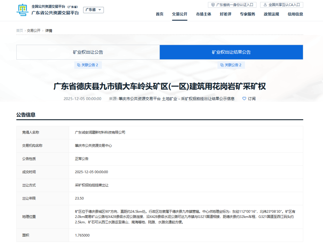近日,肇慶市公共資源交易中心成功出讓廣東省德慶縣九市鎮(zhèn)大車嶺頭礦區(qū)(一區(qū))建筑用花崗巖礦采礦權(quán)。該礦權(quán)礦區(qū)位于德慶縣城區(qū)90°方向,直距約24.5km處。行政區(qū)劃隸屬于德慶縣九市鎮(zhèn)管轄,開采儲量建筑用花崗巖16582.68萬立方米,砂質(zhì)高嶺土254.81萬立方米,出讓年限為23.5年,生產(chǎn)規(guī)模為800萬立方米/年,廣東誠安潤建新材料科技有限公司最終以底價16.13億元競得此礦。