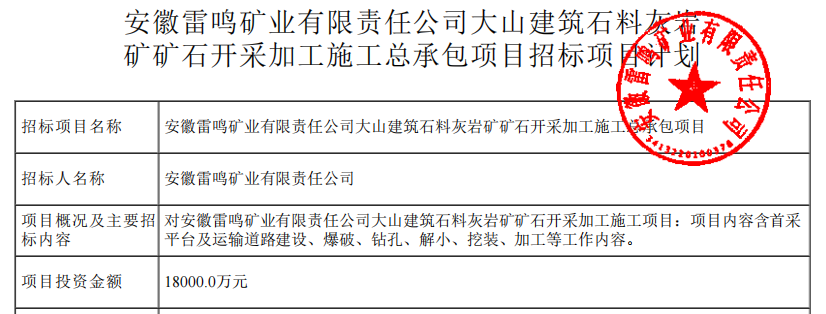 近日,安徽省宿州市公共資源交易中心發(fā)布安徽雷鳴礦業(yè)有限責任公司大山建筑石料灰?guī)r礦礦石開采加工施工總承包項目招標計劃。該項目投資額1.8億元,計劃2026年1月招標,項目內(nèi)容含首采平臺及運輸?shù)缆方ㄔO、爆破、鉆孔、解小、挖裝、加工等工作內(nèi)容。