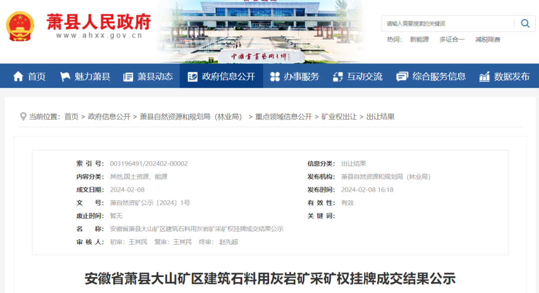 據(jù)了解,該礦位于蕭縣縣城西南225°方向直距約12.4千米處,2024年2月被安徽雷鳴科化有限責任公司以59500萬元成功競得,保有推斷資源量為2528萬立方米(6724.4萬噸),年產(chǎn)500萬噸,出讓年限14.1年,單價約為8.8元/噸。
