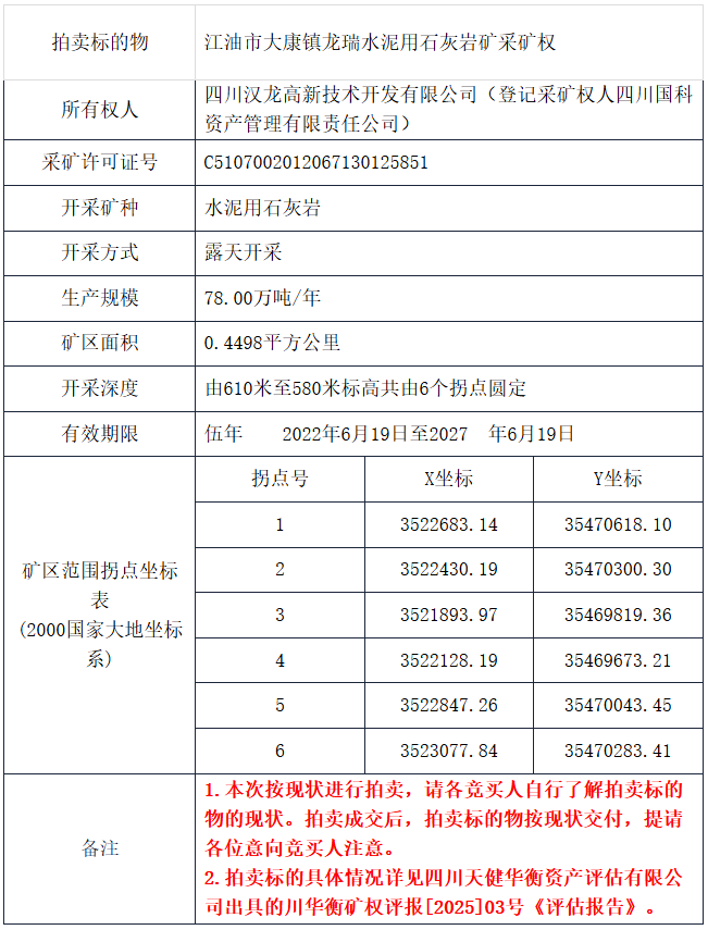 該采礦權(quán)所有權(quán)人為四川漢龍高新技術(shù)開發(fā)有限公司(登記采礦權(quán)人四川國科資產(chǎn)管理有限責任公司),開采礦種為水泥用石灰?guī)r,生產(chǎn)規(guī)模78萬噸/年。