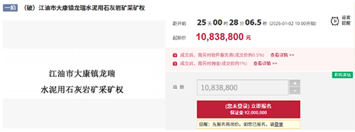 近日,據(jù)相關(guān)資產(chǎn)交易平臺信息顯示,四川省江油市大康鎮(zhèn)龍瑞水泥用石灰?guī)r礦采礦權(quán)進行轉(zhuǎn)讓,起拍價1083.88萬元。