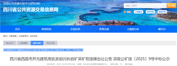 12月5日,四川省涼山州西昌市開元建筑用玄武巖閃長巖礦采礦權被當?shù)貒?mdash;—西昌順合鑫礦業(yè)有限公司成功競得。該礦總資源量超1億噸,生產規(guī)模不低于300萬噸/年,擬出讓年限30年,成交價3.1億元,單價約3.06元/噸。