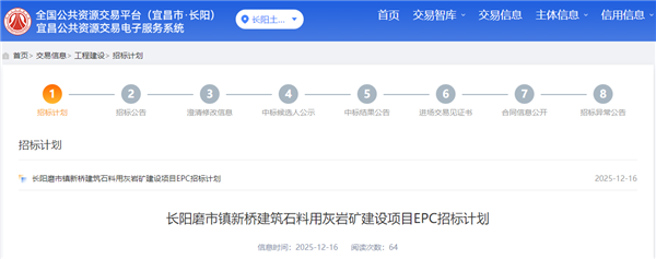 日前,湖北省宜昌市公共資源交易電子服務(wù)系統(tǒng)發(fā)布長(zhǎng)陽(yáng)磨市鎮(zhèn)新橋建筑石料用灰?guī)r建設(shè)項(xiàng)目EPC招標(biāo)計(jì)劃。該項(xiàng)目總投資7.2億元,計(jì)劃2026年1月招標(biāo)。