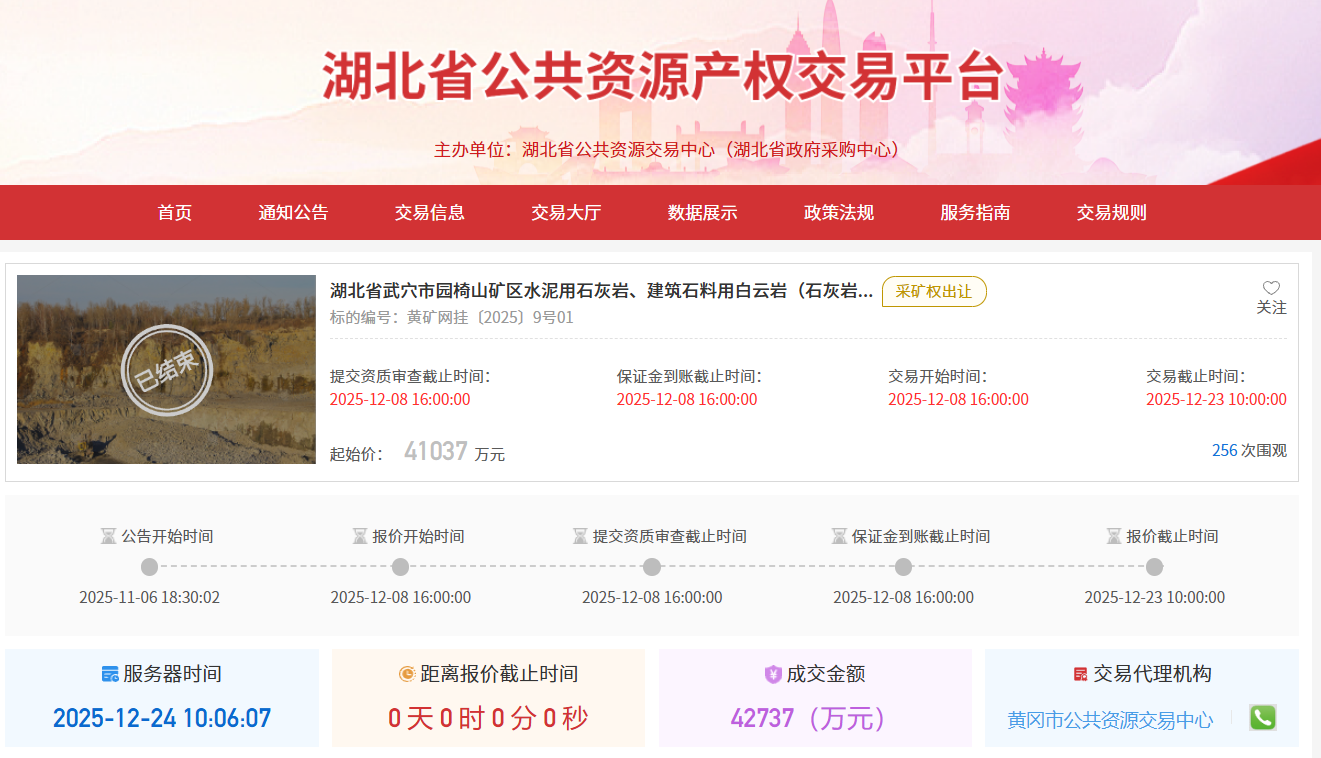 12月23日,湖北武穴市園椅山礦區(qū)水泥用石灰?guī)r、建筑石料用白云巖(石灰?guī)r)礦成功出讓。該項資源儲量超2.82億噸,生產(chǎn)規(guī)模950萬噸/年,出讓30年,掛牌起始價超4.1億元。黃岡亞東水泥有限公司報價超4.27億元競得。