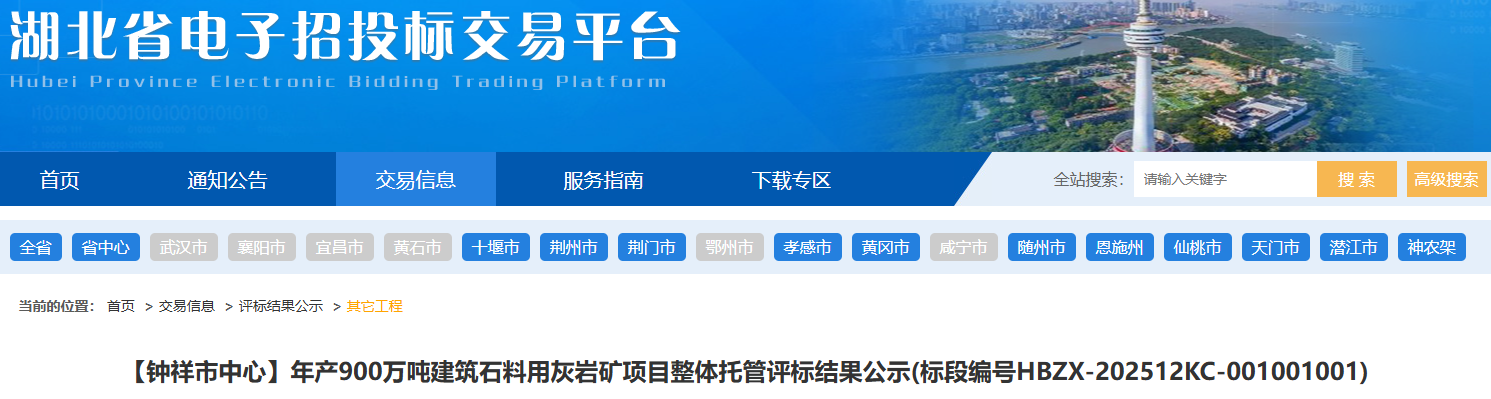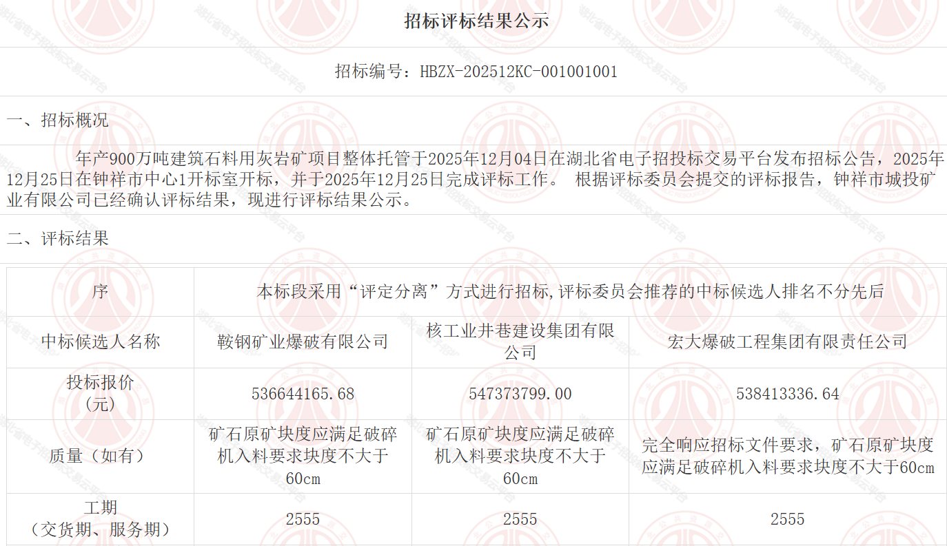12月4日,湖北省電子招投標交易平臺發(fā)布鐘祥市城投礦業(yè)有限公司年產(chǎn)900萬噸建筑石料用灰?guī)r礦項目整體托管招標公告。該項目合同估算價為整體托管“8.6元/噸*900萬噸(1年)”以及項目基建工程費用1900萬元。?今日,該招標項目正式發(fā)布中標候選人公示。
