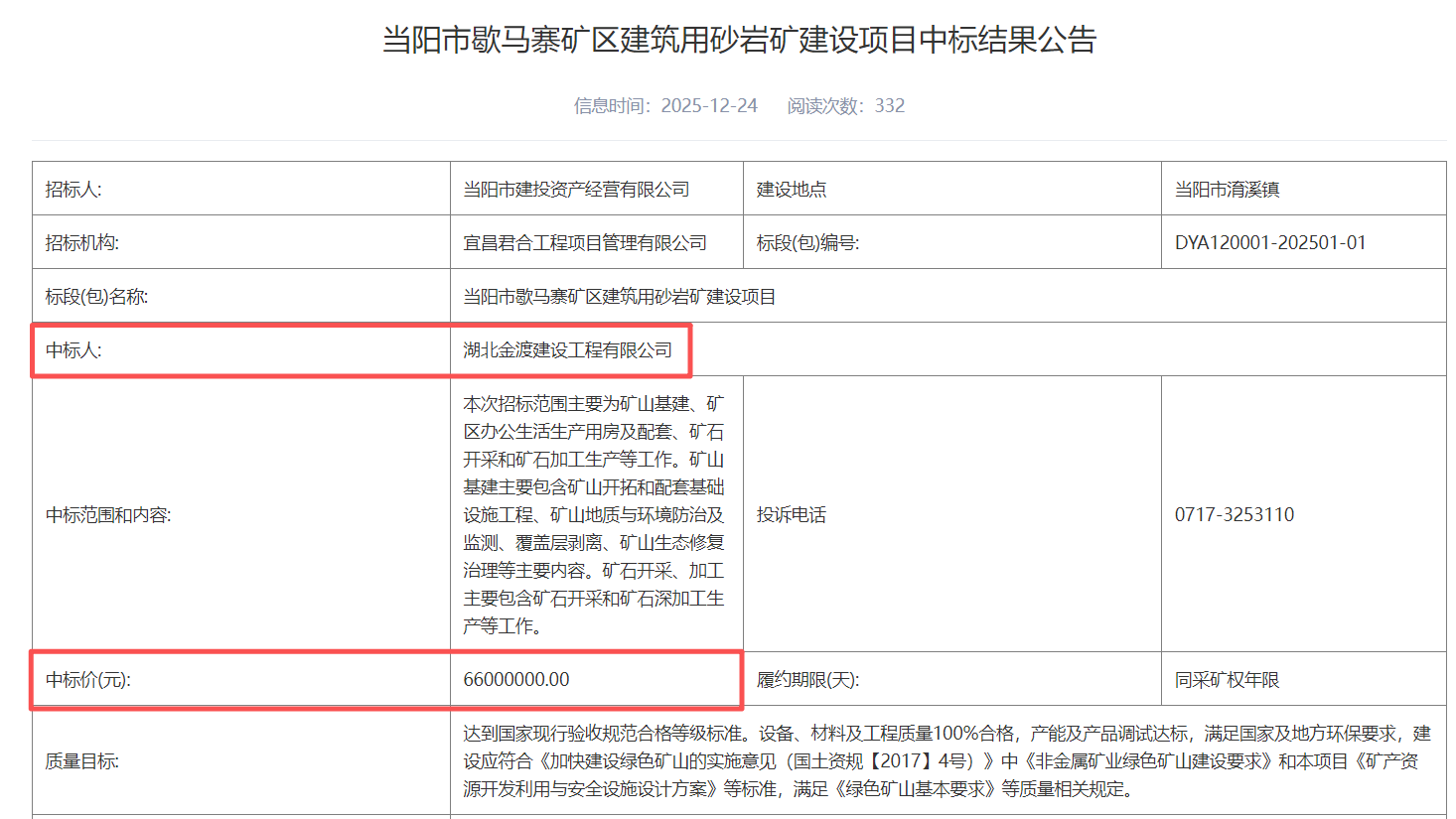 近日,湖北宜昌市公共資源交易中心發(fā)布當陽市歇馬寨礦區(qū)建筑用砂巖礦建設項目中標結果公告。湖北金渡建設工程有限公司以6600萬元中標該項目。