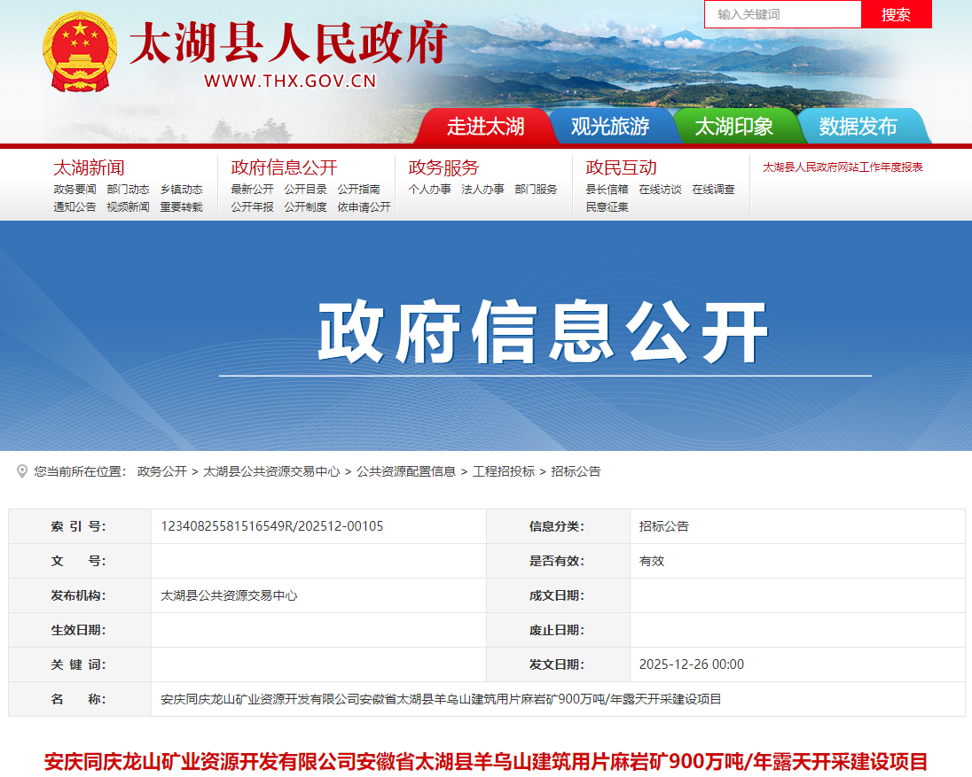 近日,安徽省太湖縣人民政府網站發(fā)布安慶同慶龍山礦業(yè)資源開發(fā)有限公司太湖縣羊烏山建筑用片麻巖礦900萬噸/年露天開采建設項目招標公告。
