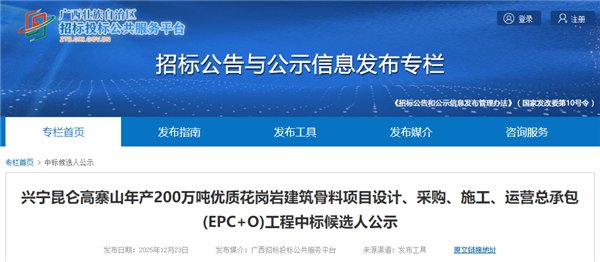 12月23日,廣西招投標(biāo)公共服務(wù)平臺(tái)發(fā)布南寧交投旗下南寧凱晟新材料有限公司興寧昆侖高寨山年產(chǎn)200萬(wàn)噸優(yōu)質(zhì)花崗巖建筑骨料項(xiàng)目設(shè)計(jì)、采購(gòu)、施工、運(yùn)營(yíng)總承包(EPC+O)工程中標(biāo)候選人公示。