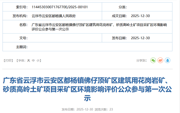 2025年12月30日,廣東云浮市云安區(qū)都楊鎮(zhèn)人民政府公示廣東省云浮市云安區(qū)都楊鎮(zhèn)佛仔頂?shù)V區(qū)建筑用花崗巖礦、砂質(zhì)高嶺土礦項目采礦區(qū)環(huán)境影響評價。