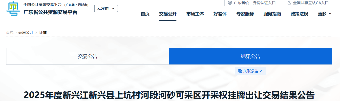近日,廣東省公共資源交易平臺發(fā)布2025年度新興江新興縣上坑村河段河砂可采區(qū)開采權(quán)掛牌出讓交易結(jié)果公告。新興縣京通建材有限公司以1286.1萬元競得該項目28.58萬方河砂開采權(quán)。
