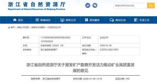 1月6日,浙江省自然資源廳印發(fā)關于激發(fā)礦產勘查開發(fā)活力推動礦業(yè)高質量發(fā)展的意見,《意見》共提出5個方面、15條政策措施,自2026年2月6日起實施。