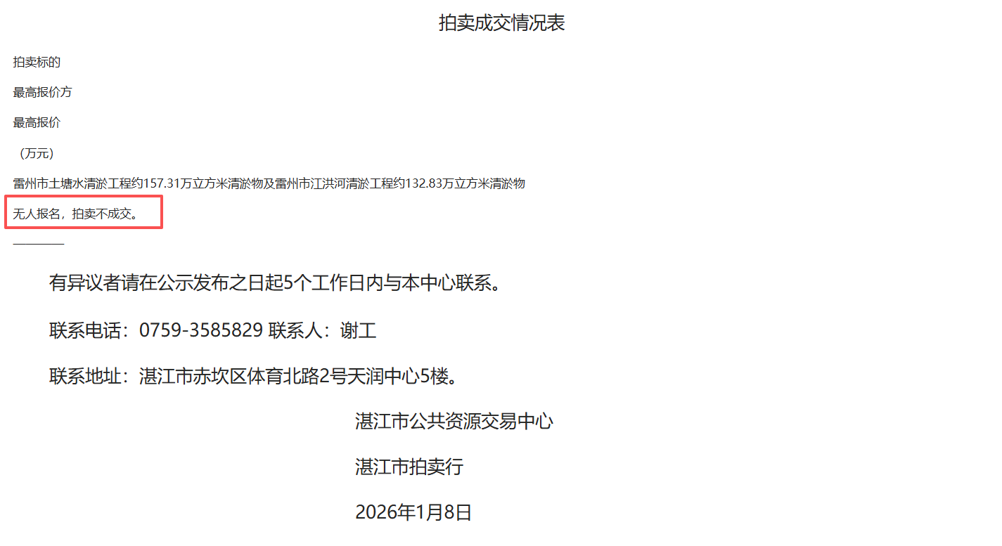 近日,廣東湛江市公共資源交易中心發(fā)布雷州市清淤工程清淤物流拍結(jié)果公示。根據(jù)公告內(nèi)容,雷州市土塘水清淤工程約157.31萬立方米清淤物及雷州市江洪河清淤工程約132.83萬立方米清淤物,起拍價(jià)為19236.8744萬元,競(jìng)買保證金3847萬元。