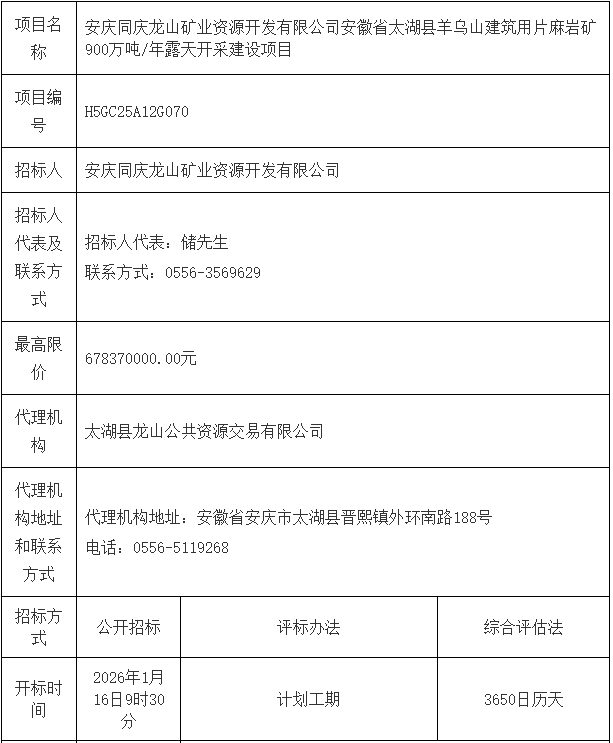 據(jù)了解,該項目擬建地點位于安徽省太湖縣城西鄉(xiāng)、江塘鄉(xiāng),建設(shè)一座年產(chǎn)900萬噸片麻巖礦。招標內(nèi)容包括礦山建設(shè)、礦山剝離、穿孔爆破、鏟裝、產(chǎn)品銷售等。合同估算價約67837萬元;計劃工期3650日歷天。
