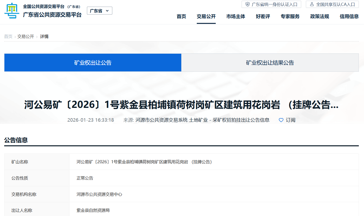 近日,廣東省公共資源交易平臺發(fā)布,紫金縣柏埔鎮(zhèn)荷樹崗礦區(qū)建筑用花崗巖礦采礦權(quán)掛牌出讓公告。