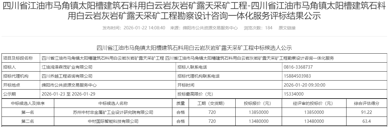 日前,四川省公共資源交易信息網(wǎng)發(fā)布江油市馬角鎮(zhèn)太陽槽建筑石料用白云巖灰?guī)r礦露天采礦工程勘察設(shè)計咨詢一體化服務(wù)評標(biāo)結(jié)果公示。第一中標(biāo)候選人為蘇州中材非金屬礦工業(yè)設(shè)計研究院有限公司,報價1385萬元;第二名為中材國際智能科技有限公司,報價1348萬元。