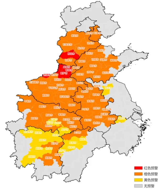 其中,河南安陽(yáng)、鶴壁、新鄉(xiāng)及河北邢臺(tái)啟動(dòng)紅色預(yù)警(Ⅰ級(jí)),天津及河北多地啟動(dòng)橙色預(yù)警,江蘇、浙江部分城市啟動(dòng)黃色預(yù)警。