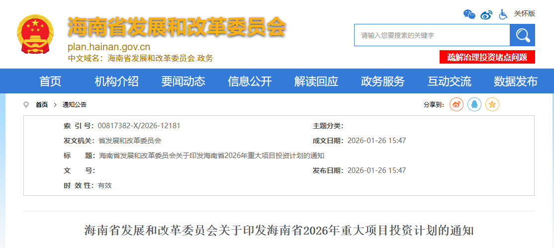 近日,海南省發(fā)展和改革委員會(huì)印發(fā)《海南省2026年重大項(xiàng)目投資計(jì)劃》。通知顯示,2026年海南省安排重大項(xiàng)目470個(gè),總投資7175億元,年度計(jì)劃投資1280億元。