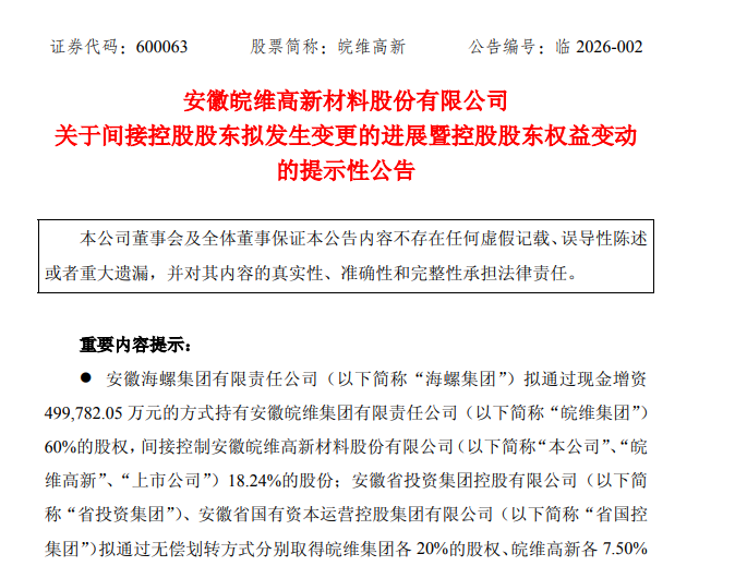 日前,A股上市公司皖維高新發(fā)布公告稱,手握1.67億噸骨料產(chǎn)能的行業(yè)巨頭海螺集團,擬通過現(xiàn)金增資49.98億元的方式持有皖維集團60%的股權(quán),間接控制皖維高新18.24%的股份。安徽省投資集團、安徽省國控集團擬通過無償劃轉(zhuǎn)方式分別取得皖維集團各20%的股權(quán)、皖維高新各7.5%的股份,上述兩家企業(yè)與海螺集團構(gòu)成一致行動人,海螺集團合計擁有皖維高新33.24%的表決權(quán)股份。