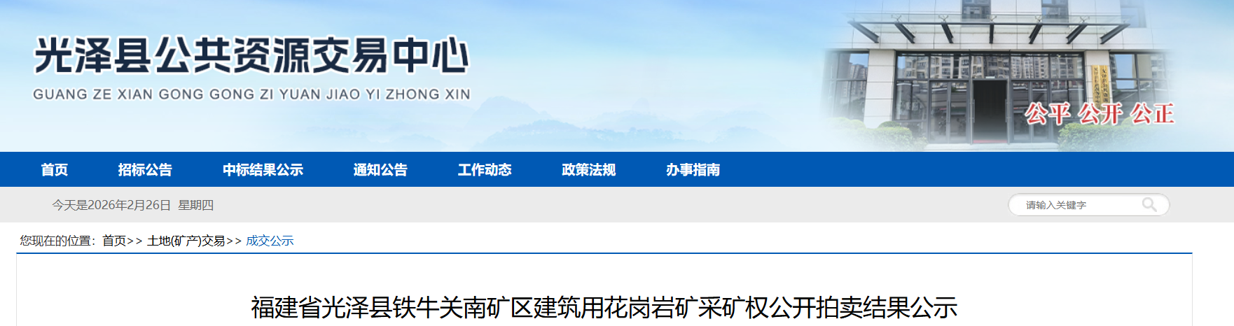 近日,福建省光澤縣光澤縣公共資源交易中心發(fā)布公告,福建省光澤縣祥彬石材有限公司競(jìng)得福建省光澤縣鐵牛關(guān)南礦區(qū)建筑用花崗巖礦采礦權(quán),該礦權(quán)資源儲(chǔ)量1274.7萬(wàn)方,礦權(quán)擬出讓年限20年,7732萬(wàn)元成交價(jià),單價(jià)約為6元/方。