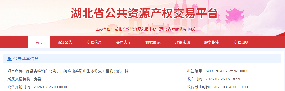 根據(jù)公告內(nèi)容,房縣青峰鎮(zhèn)白馬溝、古河床廢棄礦山生態(tài)修復(fù)工程剩余廢石料259379.87m³,參考價為36.53元/立方,總價為9475146.65元。拍賣時間為2026年3月27日下午3點。
